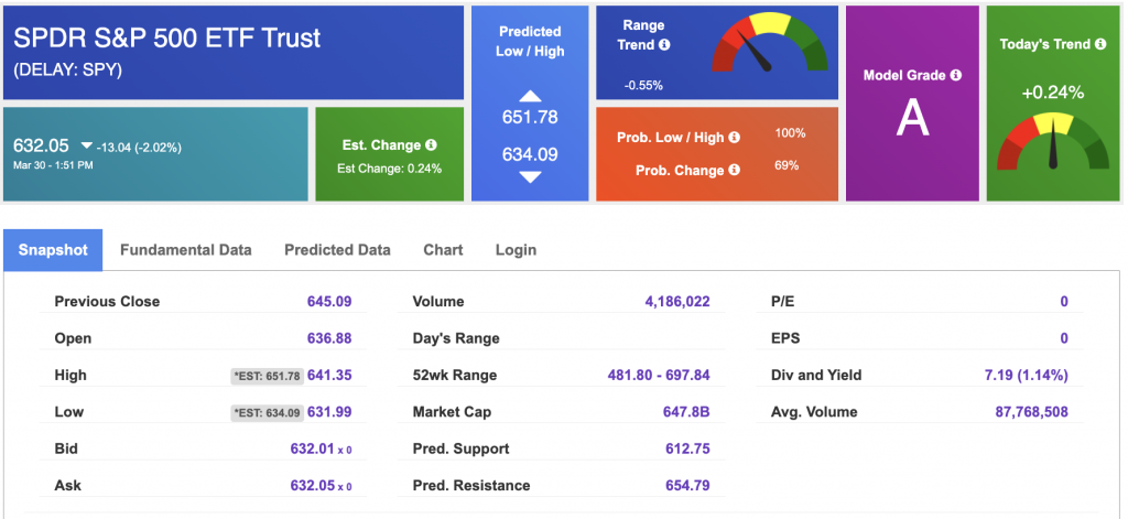 Using the “SPY” symbol to analyze the S&P 500, our 10-day prediction window shows a near-term positive outlook. Prediction data is uploaded after the market closes at 6 p.m. CST. Today’s data is based on market signals from the previous trading session.