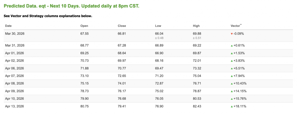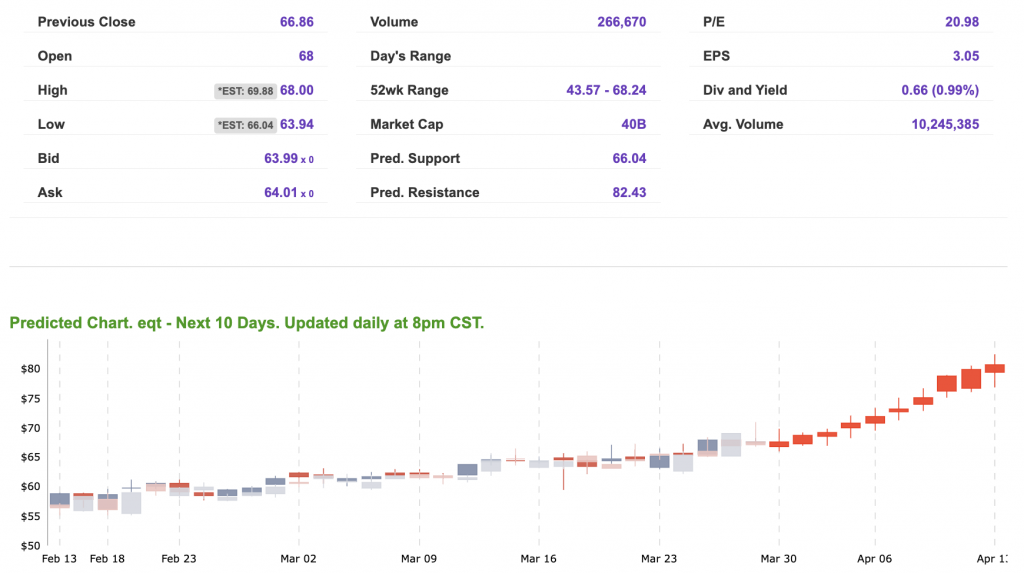 Our featured symbol for Tuesday is EQT. EQT Corp. (EQT) is showing a steady vector in our Stock Forecast Toolbox’s 10-day forecast.