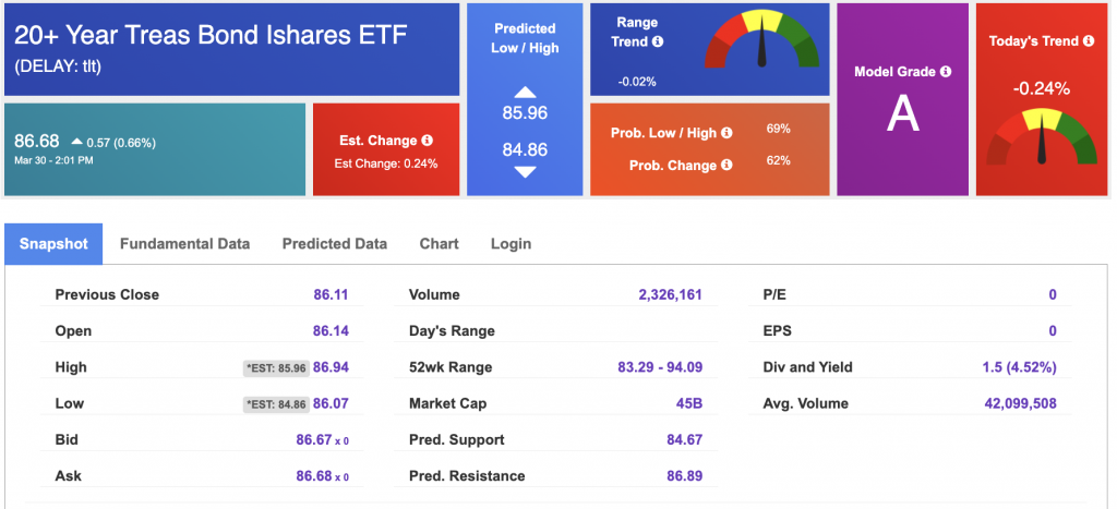 Using the iShares 20+ Year Treasury Bond ETF (TLT) as a proxy for bond prices in our Stock Forecast Tool, we see mixed signals in our 10-day prediction window. Prediction data is uploaded after the market close at 6 p.m., CST. Today’s data is based on market signals from the previous trading session.