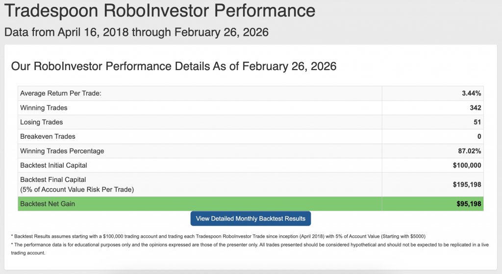 *Please note: RoboStreet is part of your free subscription service. It is not included in any paid Tradespoon subscription service. Vlad Karpel only trades his own personal money for paid subscription services. If you are a paid subscriber, please review your Premium Member Picks, ActiveTrader, MonthlyTrader, or RoboInvestor recommendations. If you are interested in receiving Vlad’s personal picks, please click here.