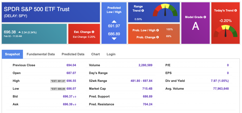 Using the “SPY” symbol to analyze the S&P 500, our 10-day prediction window shows a near-term positive outlook. Prediction data is uploaded after the market closes at 6 p.m. CST. Today’s data is based on market signals from the previous trading session.