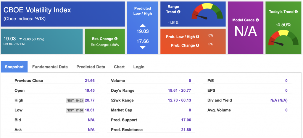 The CBOE Volatility Index (^VIX) is priced at $19.03 at the time of publication, and our 10-day prediction window shows mixed signals. Prediction data is uploaded after the market close at 6 p.m., CST. Today’s data is based on market signals from the previous trading session.