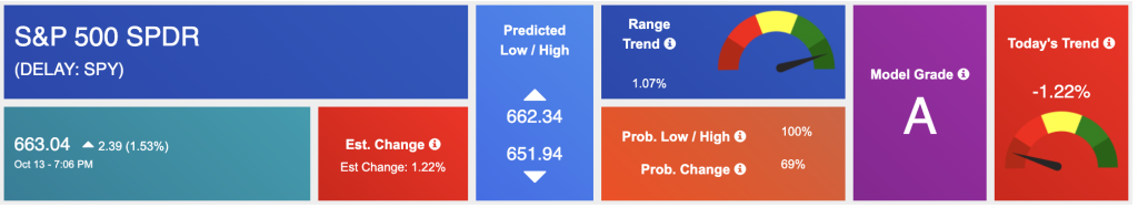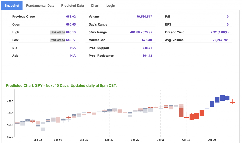Using the “SPY” symbol to analyze the S&P 500, our 10-day prediction window shows a near-term positive outlook. Prediction data is uploaded after the market closes at 6 p.m. CST. Today’s data is based on market signals from the previous trading session.