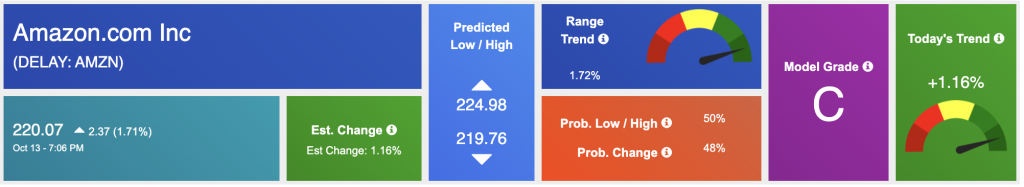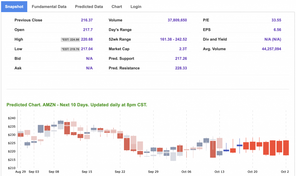 Our featured symbol for Tuesday is AMZN. Amazon.com Inc is showing a steady vector in our Stock Forecast Toolbox’s 10-day forecast.