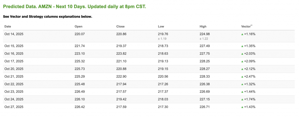 10-Day Prediction data is uploaded after the market close at 6 p.m., CST. Today’s data is based on market signals from the previous trading session.