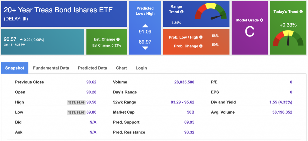 Using the iShares 20+ Year Treasury Bond ETF (TLT) as a proxy for bond prices in our Stock Forecast Tool, we see mixed signals in our 10-day prediction window. Prediction data is uploaded after the market close at 6 p.m., CST. Today’s data is based on market signals from the previous trading session.