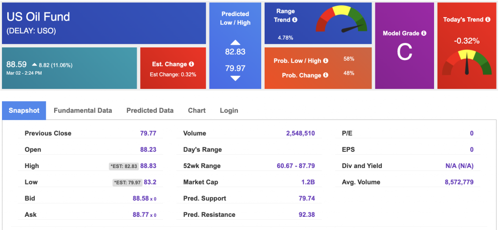 Looking at USO, a crude oil tracker, our 10-day prediction model shows mixed signals. The fund is trading at $88.59 at the time of publication. Prediction data is uploaded after the market close at 6 p.m., CST. Today’s data is based on market signals from the previous trading session.