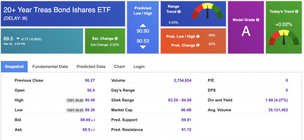Using the iShares 20+ Year Treasury Bond ETF (TLT) as a proxy for bond prices in our Stock Forecast Tool, we see mixed signals in our 10-day prediction window. Prediction data is uploaded after the market close at 6 p.m., CST. Today’s data is based on market signals from the previous trading session.