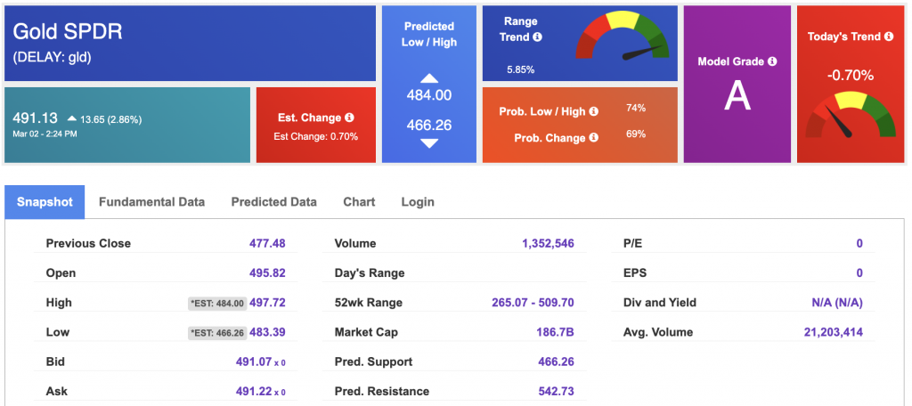 Using SPDR GOLD TRUST (GLD) as a tracker in our Stock Forecast Tool, the 10-day prediction window shows mixed signals. The gold proxy is trading at $491.13 at the time of publication. Vector signals show -0.70% for today. Prediction data is uploaded after the market close at 6 p.m., CST. Today’s data is based on market signals from the previous trading session.