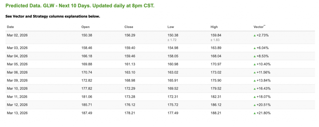 10-Day Prediction data is uploaded after the market close at 6 p.m., CST. Today’s data is based on market signals from the previous trading session.