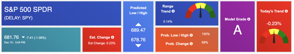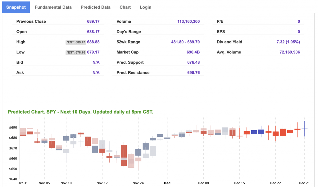 Using the “SPY” symbol to analyze the S&P 500, our 10-day prediction window shows a near-term positive outlook. Prediction data is uploaded after the market closes at 6 p.m. CST. Today’s data is based on market signals from the previous trading session.