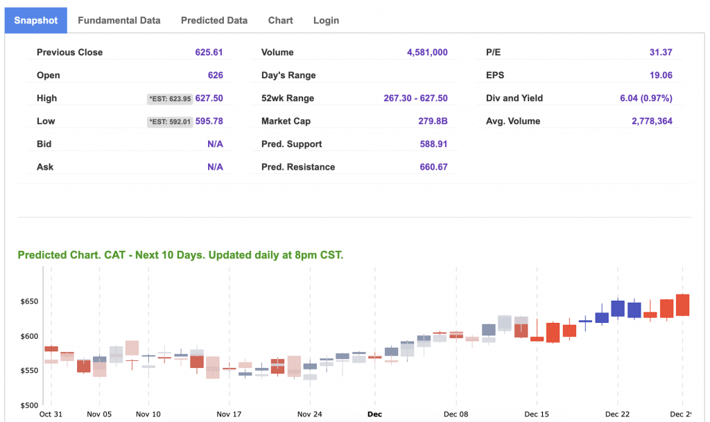 Our featured symbol for Tuesday is CAT. Caterpillar (CAT) is showing a steady vector in our Stock Forecast Toolbox’s 10-day forecast.