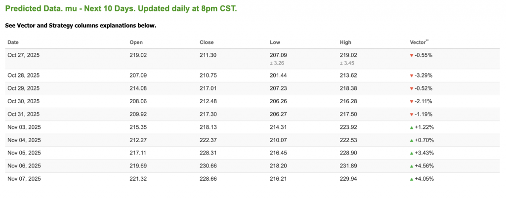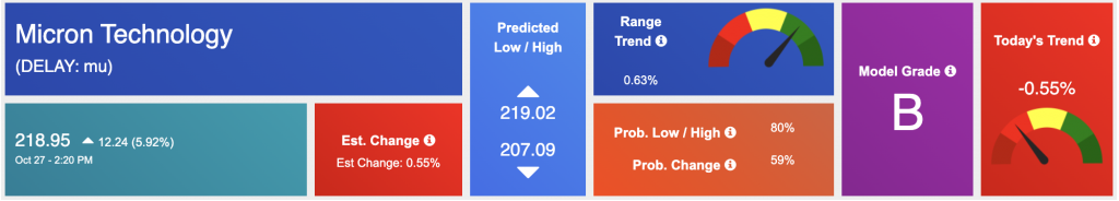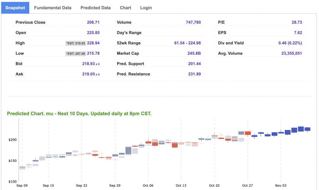 Our featured symbol for Tuesday is MU. Micron Tech (MU) is showing a steady vector in our Stock Forecast Toolbox’s 10-day forecast.