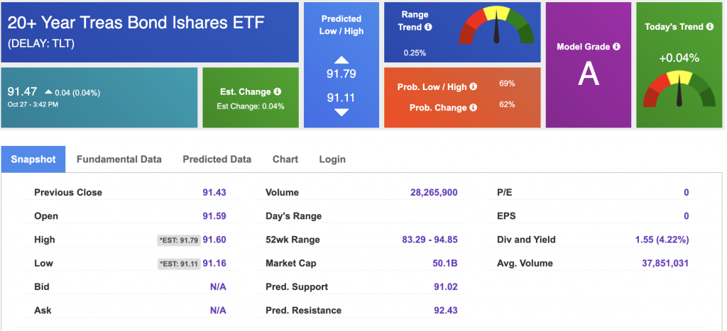 Using the iShares 20+ Year Treasury Bond ETF (TLT) as a proxy for bond prices in our Stock Forecast Tool, we see mixed signals in our 10-day prediction window. Prediction data is uploaded after the market close at 6 p.m., CST. Today’s data is based on market signals from the previous trading session.