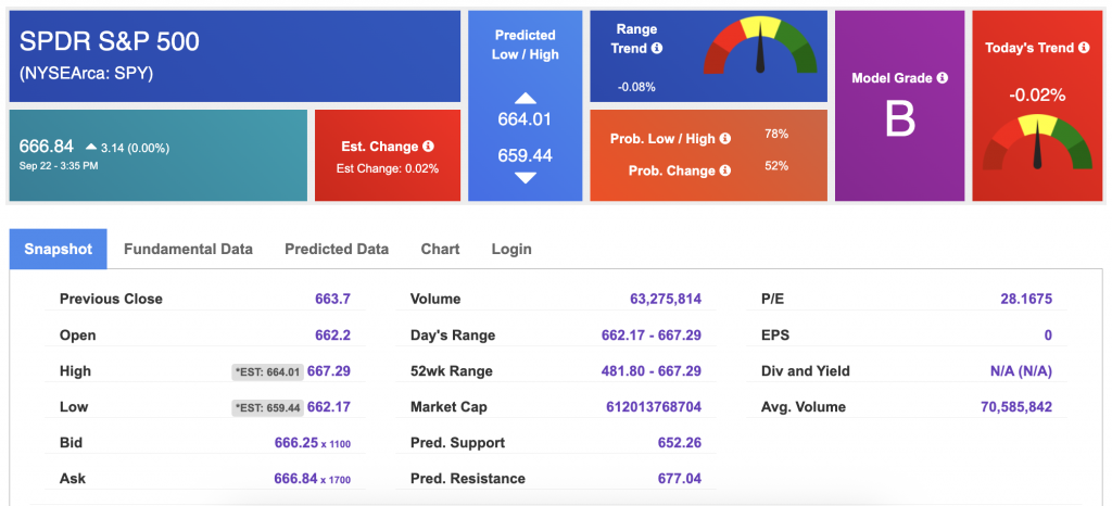 Using the “SPY” symbol to analyze the S&P 500, our 10-day prediction window shows a near-term positive outlook. Prediction data is uploaded after the market closes at 6 p.m. CST. Today’s data is based on market signals from the previous trading session.