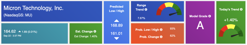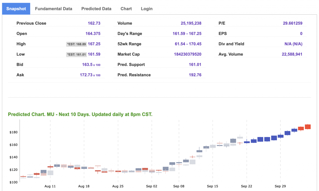 Our featured symbol for Tuesday is MU. Micron Technologies Inc. is showing a steady vector in our Stock Forecast Toolbox’s 10-day forecast.