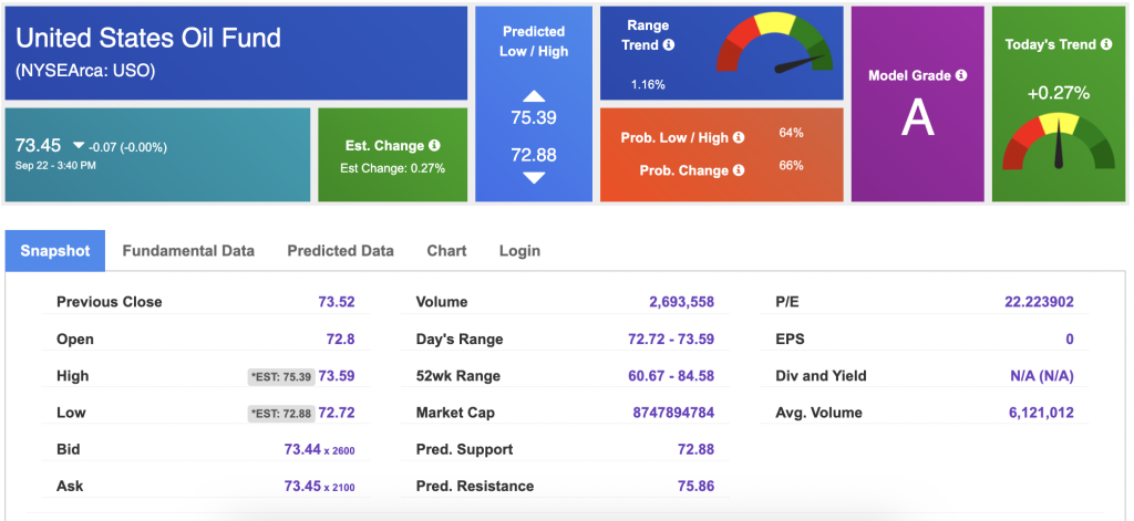 Looking at USO, a crude oil tracker, our 10-day prediction model shows mixed signals. The fund is trading at $73.45 at the time of publication. Prediction data is uploaded after the market close at 6 p.m., CST. Today’s data is based on market signals from the previous trading session.