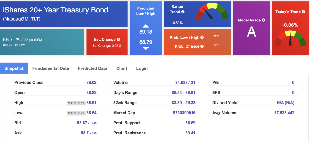 Using the iShares 20+ Year Treasury Bond ETF (TLT) as a proxy for bond prices in our Stock Forecast Tool, we see mixed signals in our 10-day prediction window. Prediction data is uploaded after the market close at 6 p.m., CST. Today’s data is based on market signals from the previous trading session.
