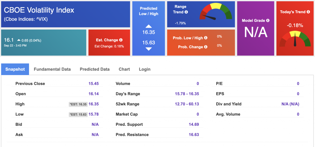 The CBOE Volatility Index (^VIX) is priced at $16.2 at the time of publication, and our 10-day prediction window shows mixed signals. Prediction data is uploaded after the market close at 6 p.m., CST. Today’s data is based on market signals from the previous trading session.